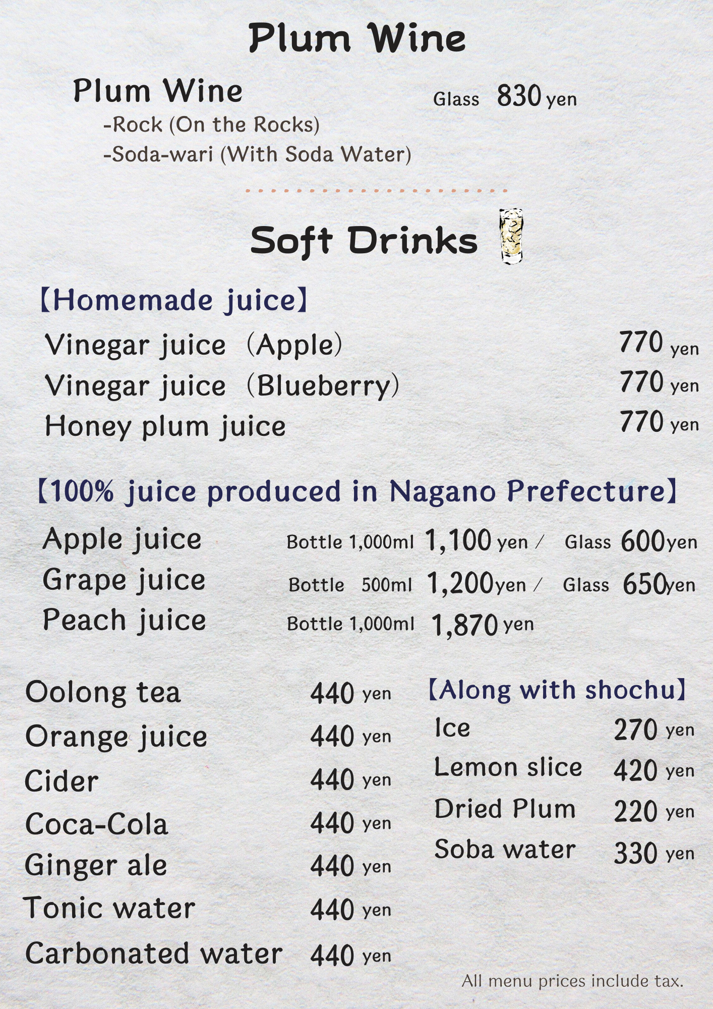 英語版飲料メニュー表
